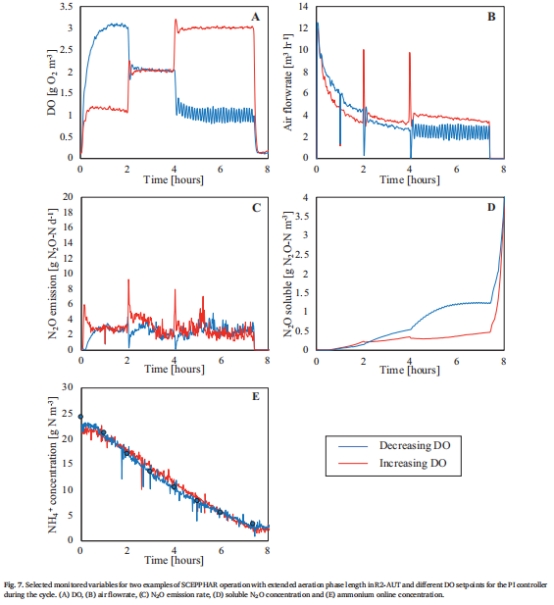 間歇曝氣實(shí)驗(yàn):通過(guò)ON/OFF控制(DO閾值1–2 g O?/m3)驗(yàn)證減排效果(圖6)。