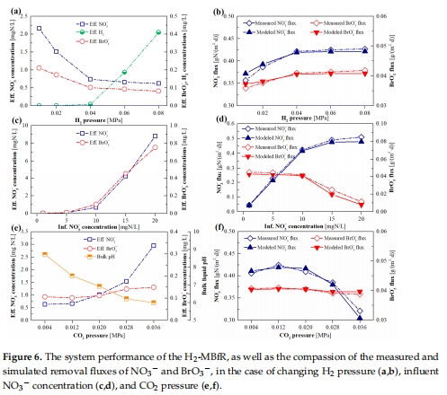 最佳H?壓力:0.04 MPa時BrO??和NO??去除通量最高(0.041 g/(m2·d)和0.42 g N/(m2·d)),且H?損失最?。▓D6a,b)。