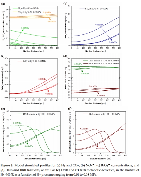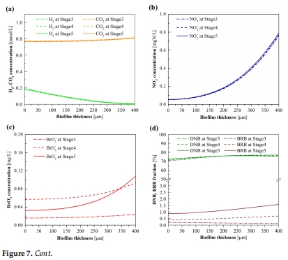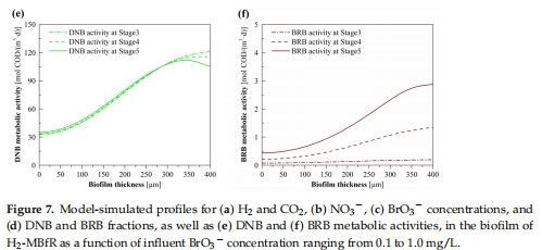 模擬生物膜內底物梯度(H?、BrO??、NO??)、微生物分布(BRB/DNB占比)及代謝活性空間變化(圖7–10)。