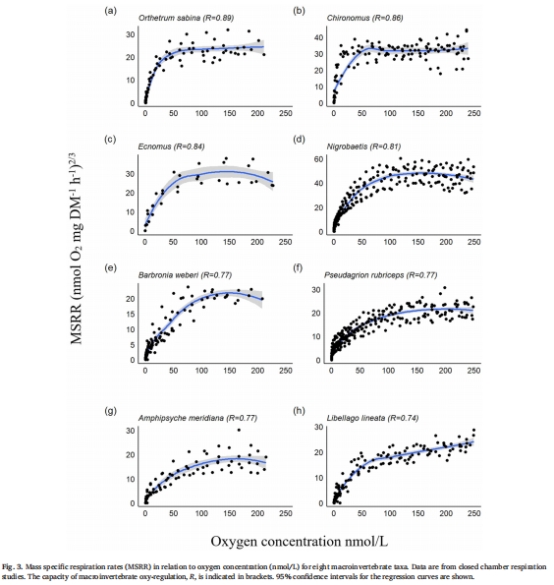 使用Unisense微電極(500μm尖端)在封閉呼吸室測定8類水生昆蟲的氧調(diào)節(jié)能力(R值,圖3)。