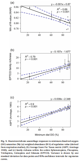 生態(tài)系統(tǒng)響應:污染河段的大型無脊椎動物群落氧調(diào)節(jié)能力(WAR)與最小DO飽和度顯著負相關(guān)(R2=0.69, p<0.001;圖5a),生物多樣性(EPTCO豐富度)和耐污指數(shù)(ASPT)同步下降(R2≥0.79;圖5b-c)。