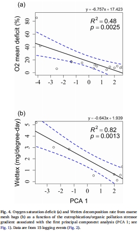 分解速率:污染河段Wettex分解速率達5.45 mg/度日(vs. 原始河段0.12 mg/度日),與營養(yǎng)鹽負荷正相關(guān)(R2=0.82, p=0.001;圖4b)。