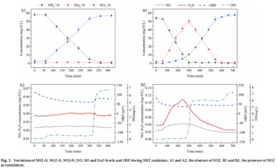 亞硝酸鹽(NO??)積累驅(qū)動N?O生成:氨氧化過程中NO??積累時,N?O是主要產(chǎn)物(圖1B2),峰值濃度達0.15 mg-N/L。