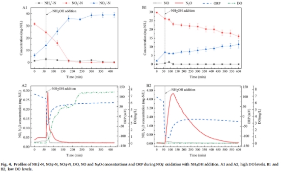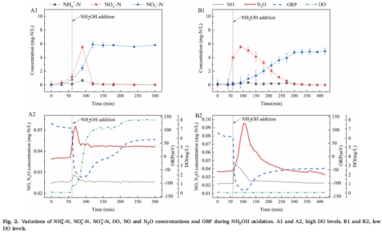 NH?OH氧化與DO正相關:NH?OH氧化產(chǎn)生的NO和N?O總量與溶解氧(DO)水平呈正相關(圖2A2/B2),高DO下總產(chǎn)量更高(NO: 0.159 mg-N/L, N?O: 0.363 mg-N/L)。