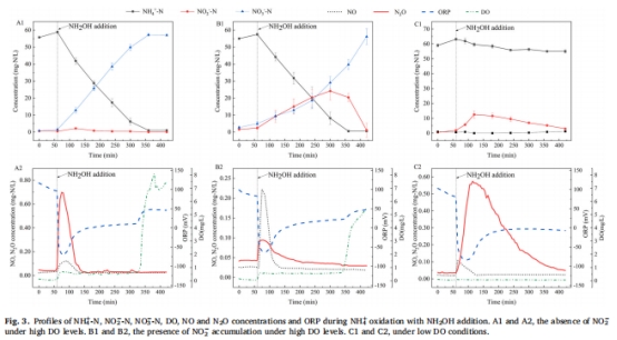 NH?OH添加加劇氣體排放:氨氧化過程中添加NH?OH顯著提升NO和N?O產(chǎn)量(圖3A2),高DO下N?O峰值達0.698 mg-N/L。