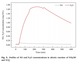非生物反應貢獻顯著:NH?OH與NO??的化學反應可直接生成N?O(峰值1.719 mg-N/L),占氣體總產(chǎn)量的30%以上(圖5)。