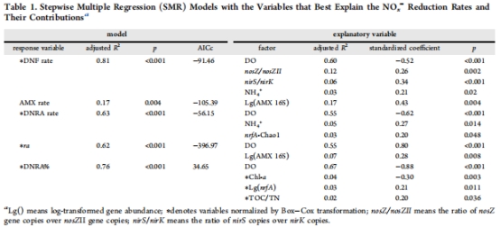 數據:SMR模型顯示DO解釋反硝化速率變異的54%(表1);反硝化速率與Chl-a正相關(r=0.81, p<0.01),DNRA%與溫度正相關(r=0.62, p<0.01)(圖5c-e)。