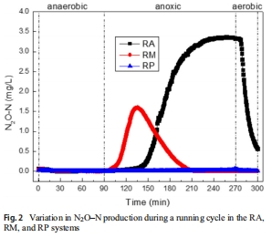 N?O峰值與NO??積累正相關(guān)(RA:3.3 mg N/L vs. RP:≈0 mg N/L,圖2)。