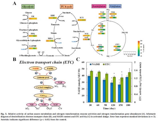 分子機(jī)制:nano-TiO?抑制碳源代謝(GAPDH、MDA酶活性↓)、電子傳遞鏈(ETC活性↓)及反硝化酶(NOS活性↓),導(dǎo)致電子競(jìng)爭(zhēng)失衡(圖5)。