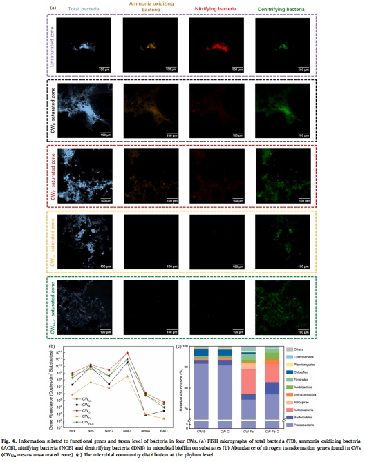 本研究通過構(gòu)建部分非飽和人工濕地(CWs)系統(tǒng),探究Fe-C微電解基質(zhì)對低碳氮比(C/N=4)廢水中氮磷同步高效去除的機制。核心發(fā)現(xiàn):