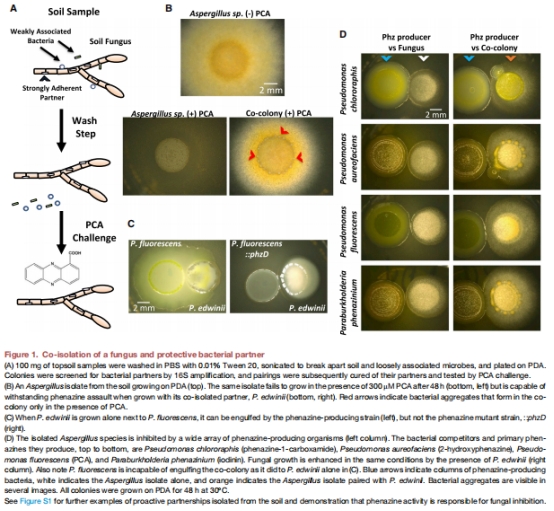 物理共生對(duì)的形成:從土壤中分離出真菌-細(xì)菌共生對(duì),真菌在缺乏細(xì)菌時(shí)對(duì)PCA敏感(抑制濃度>300 μM),而細(xì)菌存在時(shí)真菌生長(zhǎng)恢復(fù)(圖1B)。