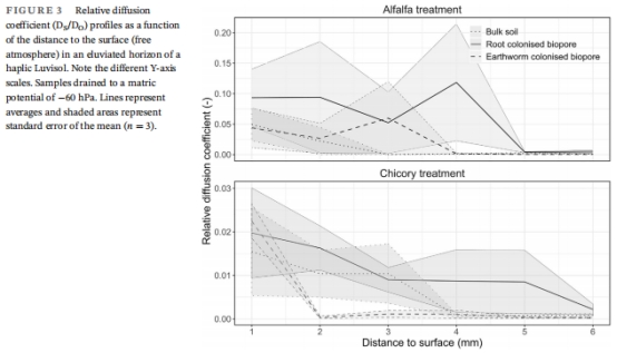 根際側向孔隙度:35%(苜蓿)、32%(菊苣),顯著高于蚯蚓孔(25%)。