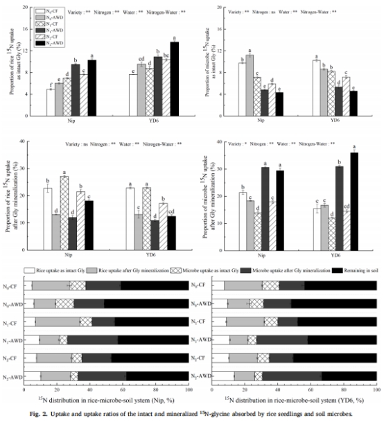 氮分配機制:AWD通過降低微生物對1?N-甘氨酸的攝取(尤其在N1/N2水平),促進水稻對礦化氮的吸收,優化氮素利用效率(圖3)。