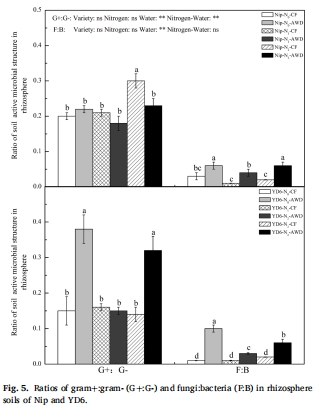微生物群落響應:AWD增加根際革蘭氏陰性菌和真菌豐度,提高真菌:細菌(F:B)比值(圖4-5),增強土壤有機質礦化能力。