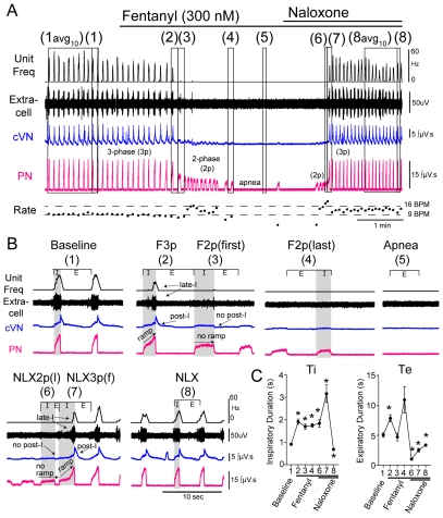 芬太尼期:灌流含芬太尼(300 nM)溶液,誘導呼吸暫停(圖1B)。