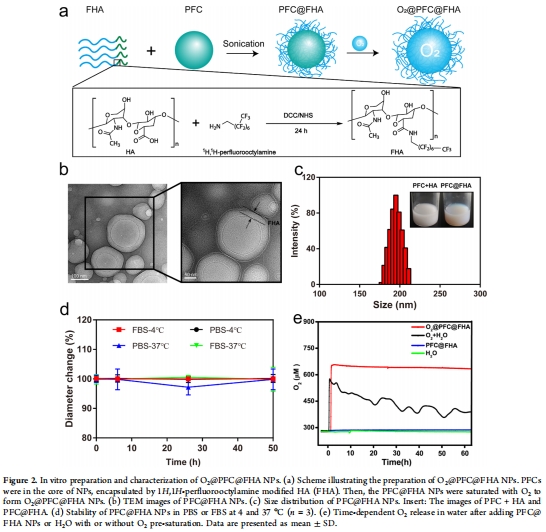 通過氟化修飾的透明質酸(FHA)封裝O?飽和的全氟化碳(PFC),形成納米顆粒(~195 nm)。