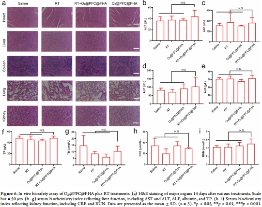療效與安全:聯合放療顯著抑制腫瘤生長(圖5a),H&E和血清生化證實無肝腎毒性(圖6)。