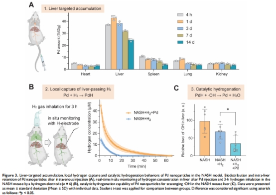 Pd納米顆粒通過儲氫-催化雙功能實現(xiàn):①肝臟靶向氫富集 ②·OH高效清除。