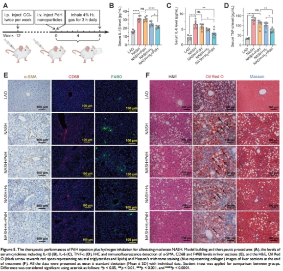 在小鼠非酒精性脂肪性肝炎(NASH)模型中,該策略使血清炎癥因子(IL-1β/TNF-α/IL-6)降低2-3倍(圖4D-F),肝脂質沉積減少40%(圖4G)。