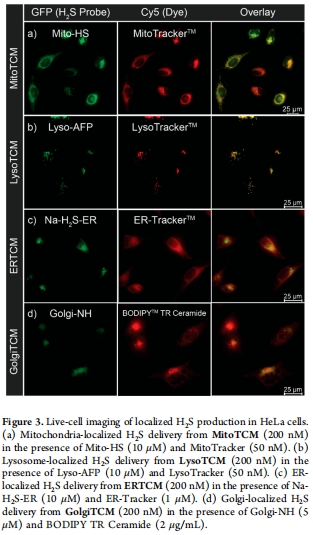 定位成像:使用細胞器特異性H?S熒光探針(如Mito-HS、Lyso-AFP)確認H?S靶向釋放(圖3)。