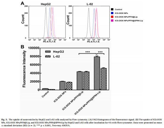 靶向性:SP94肽顯著增強(qiáng)納米囊泡對(duì)肝癌細(xì)胞(HepG2)的靶向性(攝取率↑77%,圖5B)。