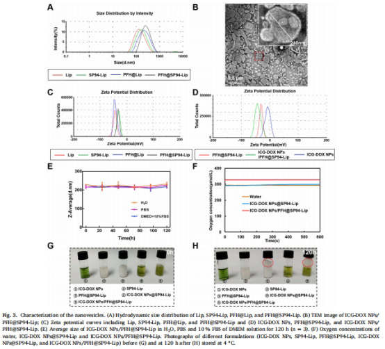 對(duì)比ICG-DOX NPs@SP94-Lip(無(wú)PFH)與ICG-DOX NPs/PFH@SP94-Lip(含PFH)的溶解氧差異(圖3F)。