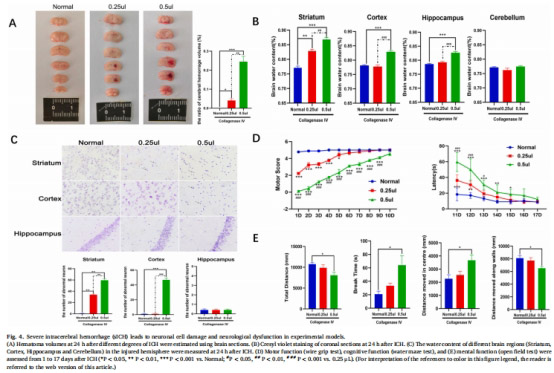 模型:膠原酶誘導小鼠嚴重ICH(0.5μL,紋狀體/皮層/海馬多區域損傷,圖4A)。