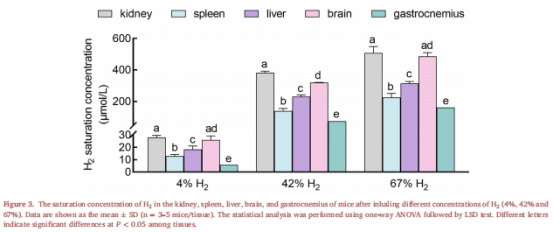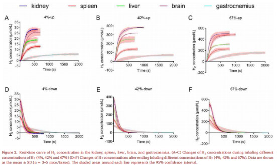 劑量依賴性:吸入H?濃度(4%、42%、67%)與組織飽和濃度呈正相關(guān)(圖3)。