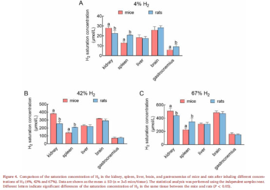 種屬對(duì)比:小鼠與大鼠的H?飽和濃度在肝、腦中無差異,但在腎、脾中差異顯著(圖4)。