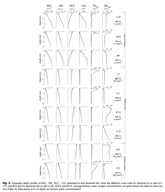 ? 數據:缺氧站位(如LL3A)孔隙水Fe/Mn富集(最高400μM),硫化站位(JML)Fe被固定