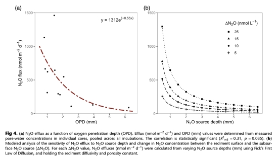 2. OPD變淺(低氧導致)使N?O通量顯著增加,因產生區更接近沉積物-水界面。