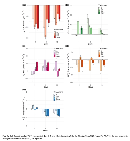 ? 數(shù)據(jù):所有處理凈耗氧(-41至-146 mmol O2 m?2 d?1),蠕蟲處理(SO/SOV)耗氧量高于植被處理(SV)。