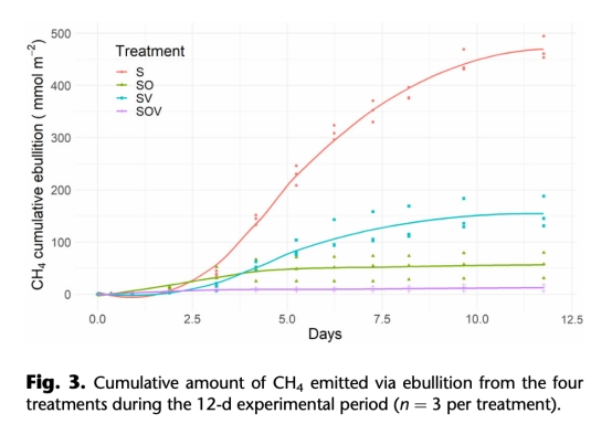 ? 數(shù)據(jù):裸露沉積物(S)累計排放470±22 mmol CH4 m?2;植被(SV)減少67%,蠕蟲(SO)減少88%,協(xié)同處理(SOV)減少97%。