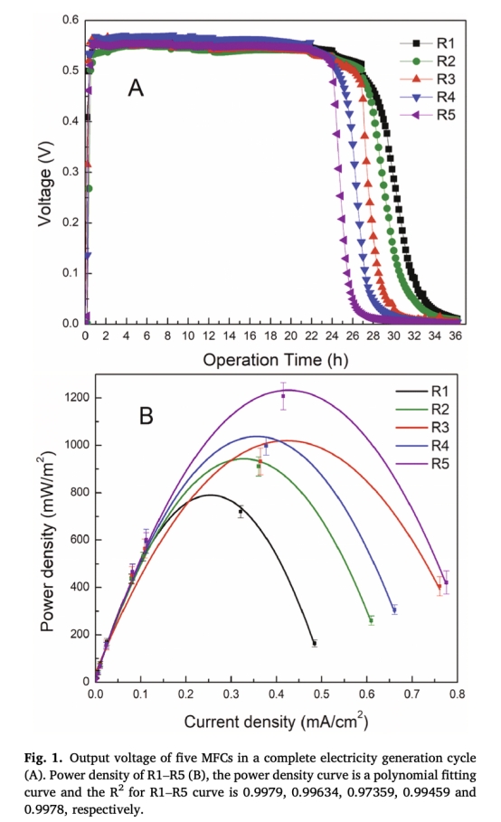 ? 數(shù)據(jù):低COD/N組(R5)最大功率密度(1232.54 mW/m2)比無氮組(R1, 790.13 mW/m2)高56%,內(nèi)阻降低44%(95.85 Ω vs 171.03 Ω)。