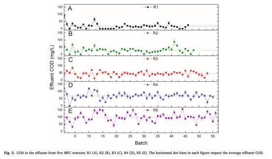 ? 低COD/N(2/1-4/1)提升NH??-N去除(71.9 mg/L)和功率密度(1232 mW/m2),但COD殘留高(98.5 mg/L)且恢復(fù)能力差。