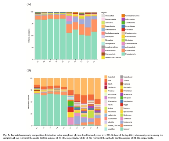 ? 陽極:Geobacter占比穩(wěn)定(64-67%),Lentimicrobium豐度隨COD/N降低而升高(R1:0.19% → R5:6.48%)