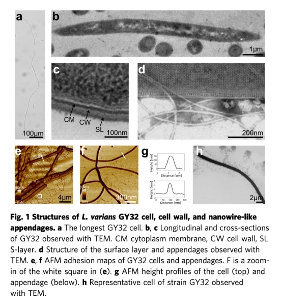 本文首次報道了一種絲狀革蘭氏陽性菌(Lysinibacillus varians GY32)具備雙向胞外電子傳遞(EET)能力。該菌株可在微生物燃料電池(MFC)中形成厘米級導(dǎo)電細(xì)胞網(wǎng)絡(luò),細(xì)胞長度可達(dá)1.08毫米。通過原子力顯微鏡(AFM)和微電極分析,發(fā)現(xiàn)其導(dǎo)電性與類似菌毛的蛋白質(zhì)附屬物相關(guān)。結(jié)果表明長距離電子傳遞(LDET)不僅限于革蘭氏陰性菌。
