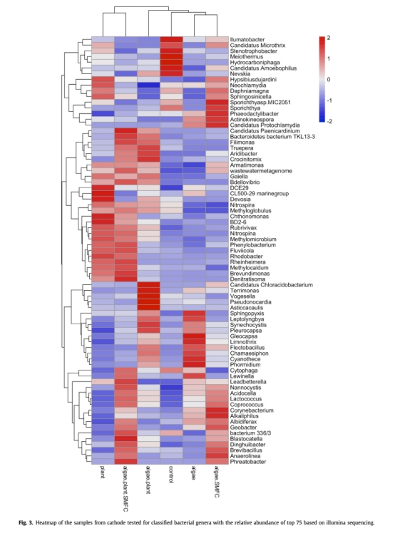 ? 數據:藻類+植物+SMFC組陽極富集脫氮菌(Thiobacillus、Sulfuricurvum)和固氮PGPR(Bradyrhizobium、Paenibacillus)。