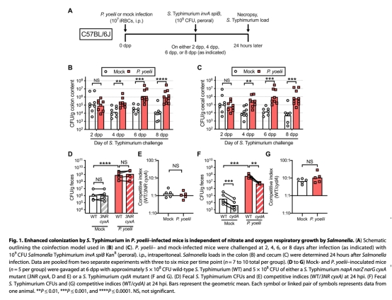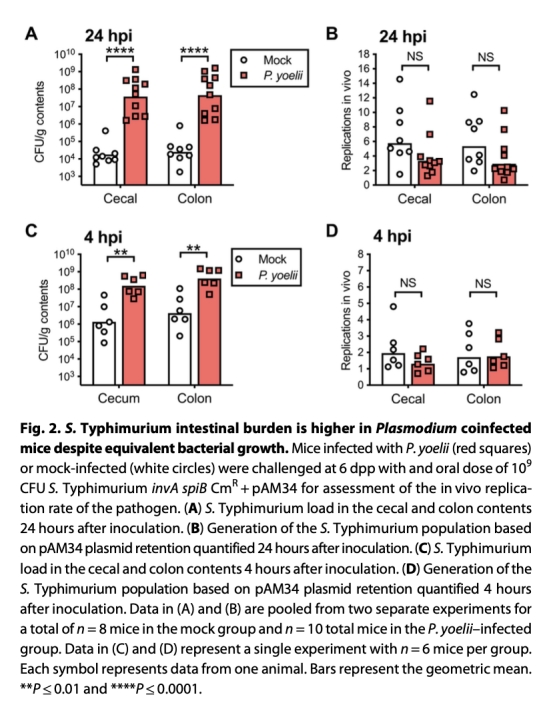 1. 建立瘧疾-沙門氏菌共感染模型:小鼠感染P. yoelii后6天(寄生蟲(chóng)血癥高峰期)口服沙門氏菌(毒力缺陷株invA spiB)。