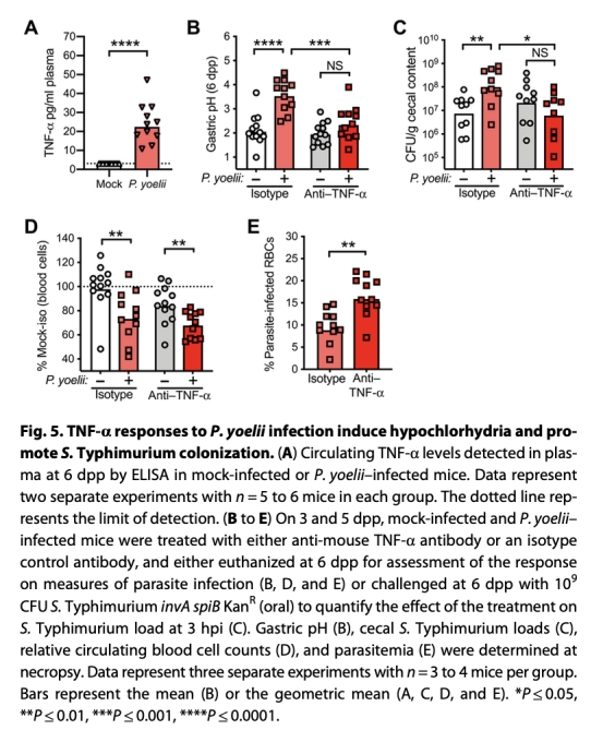 ? 數(shù)據(jù):感染組胃組織TNF-α mRNA↑(圖4F);血漿TNF-α↑(圖5A);TNF-α抗體阻斷預(yù)防胃酸升高(圖5B)和沙門氏菌定植增加(圖5C)。