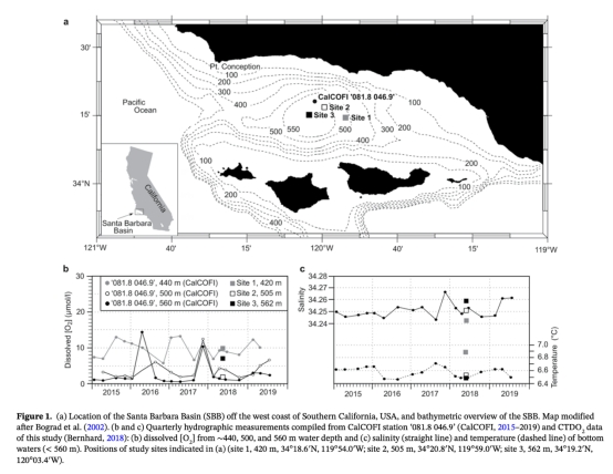 1. 樣本采集:在圣巴巴拉盆地三個(gè)低氧站點(diǎn)(水深420–567 m)采集沉積物巖芯和底層水樣本,測(cè)量原位溶解氧(丹麥Unisense微電極)和孔隙水金屬濃度。