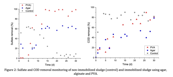 2. 動力學實驗:在厭氧瓶中測試固定化污泥的硫酸鹽還原速率(圖1,表2)和COD去除效率。