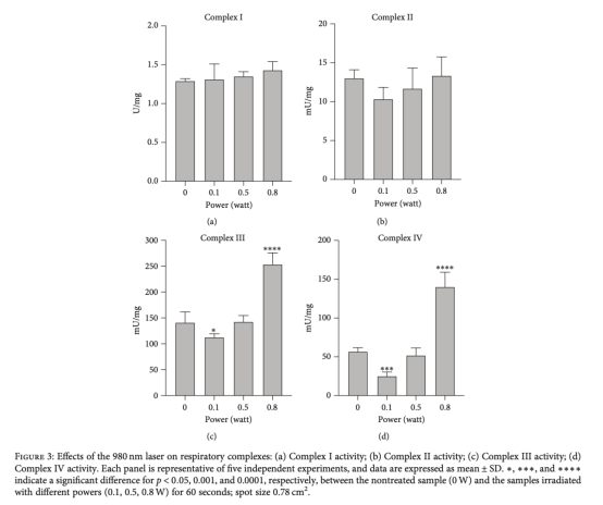 ? 數據:僅復合物III和IV受激光調控(0.1W抑制,0.8W激活),復合物I/II無變化。