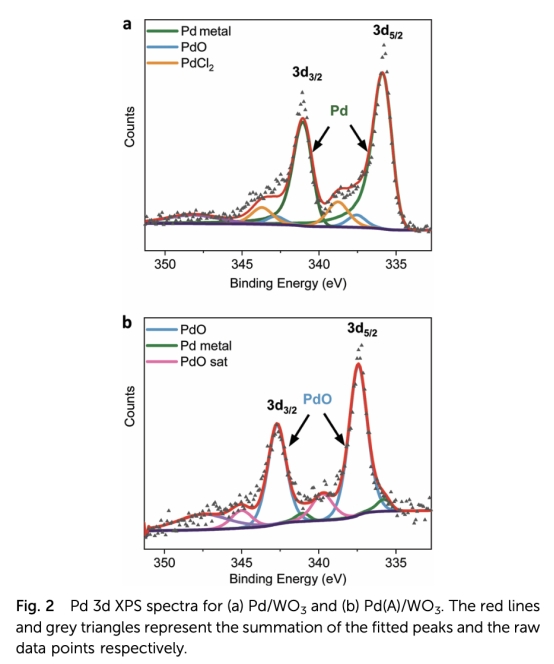 ? XPS驗證Pd氧化態(圖2:Pd/WO?中Pd?為主,Pd(A)/WO?中Pd2?(PdO)為主);