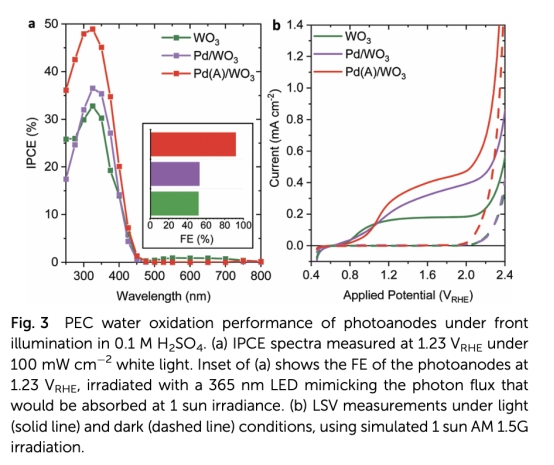 ? 測量內容:Pd(A)/WO?在1.23 VRHE下光電流達0.28 mA·cm?2,較WO3(0.16 mA·cm?2)提升75%;IPCE譜顯示響應區間300-450 nm。