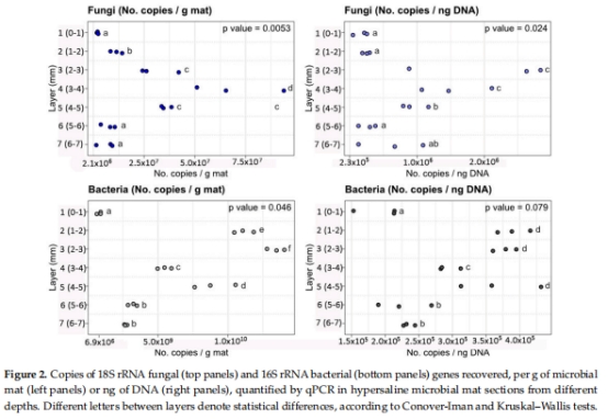 本研究首次通過 qPCR定量 和 宏基因組測序 技術,系統分析了墨西哥瓜納羅內格羅高鹽微生物墊(0–7 mm深度)中真菌的豐度與多樣性。