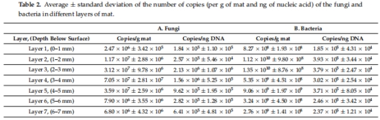 真菌豐度:真菌18S rRNA基因拷貝數為10?–10?/g,比細菌低2個數量級(圖2,表2)。