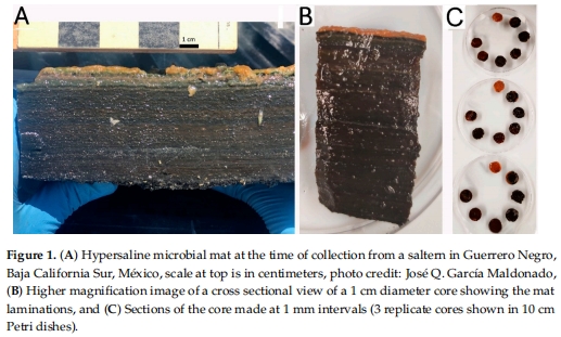采集瓜納羅內格羅鹽場高鹽微生物墊(鹽度125 ppt),按 1 mm間隔 分層(0–7 mm)(圖1C)。