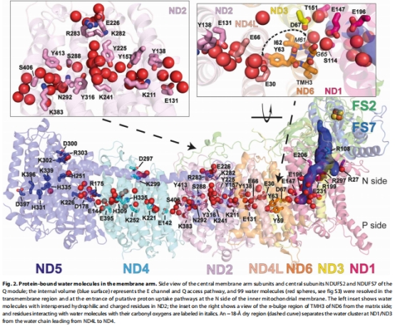 數據來源:冷凍電鏡結構(2.1 ?)顯示膜臂亞基(ND2、ND4、ND5)中的 99個水分子(紅色球體)。