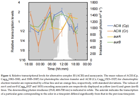 結果:夜間高表達(厭氧期合成色素),日間受O?抑制。